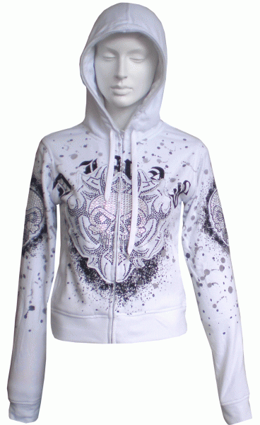 mikina s kapucí, na zip, motiv lebka na obou rukávech, foto detail